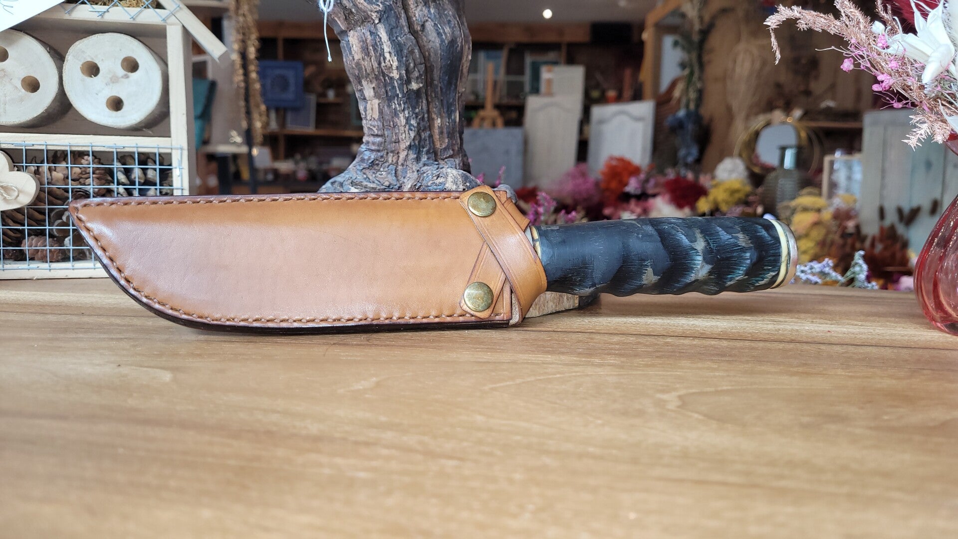 Étui à couteau artisanal dont la taille nécessite un étui en cuir sur-mesure. Lame 25cm.
