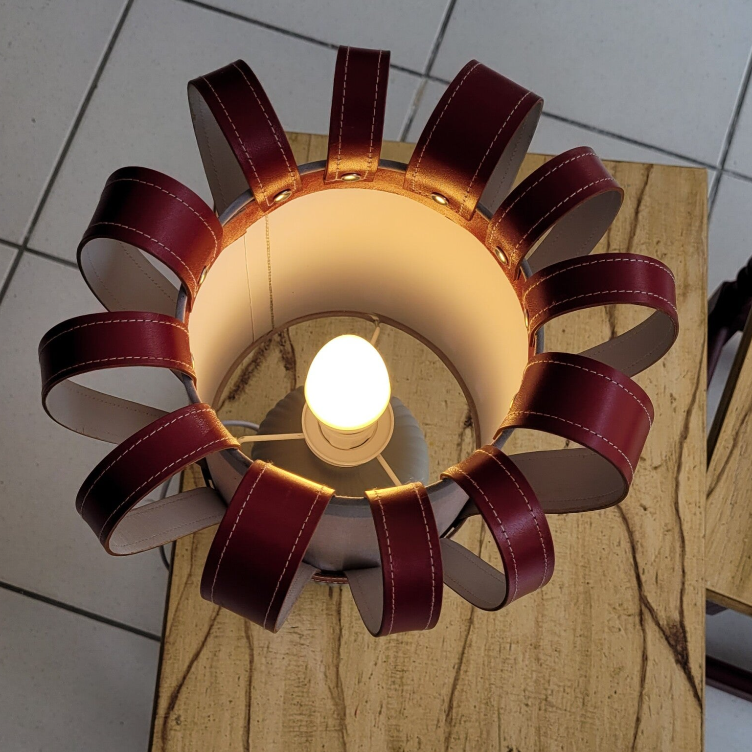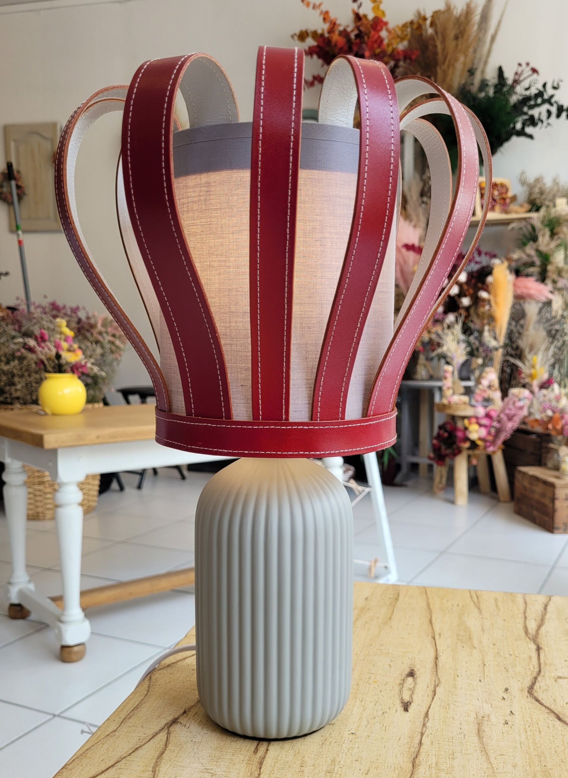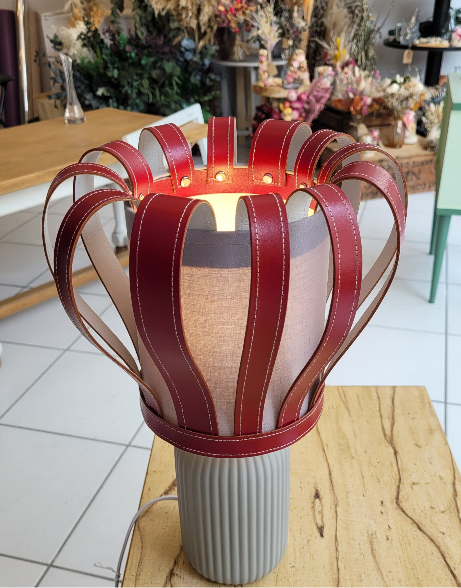 En cuir de vachette, grenat doublé mapa gris clair, cette lampe deviendra la pièce maîtresse de votre décoration d'intérieur le jour et prendra des allures de fleur au bouton d'or une fois allumée le soir.