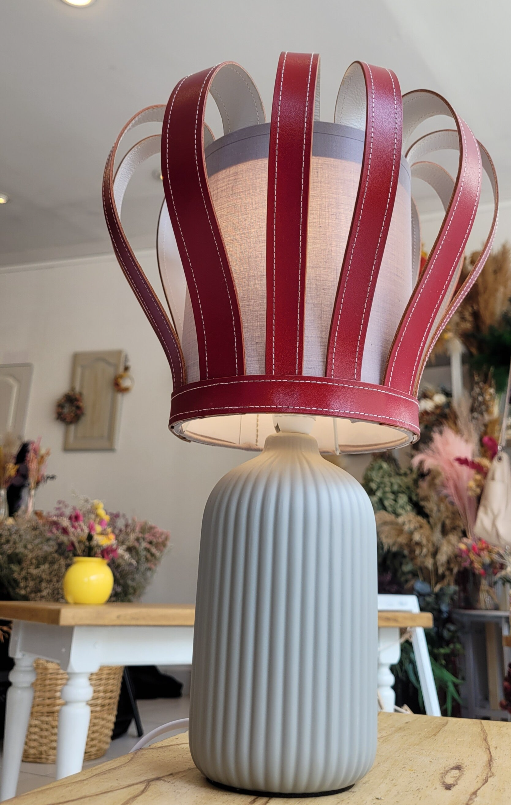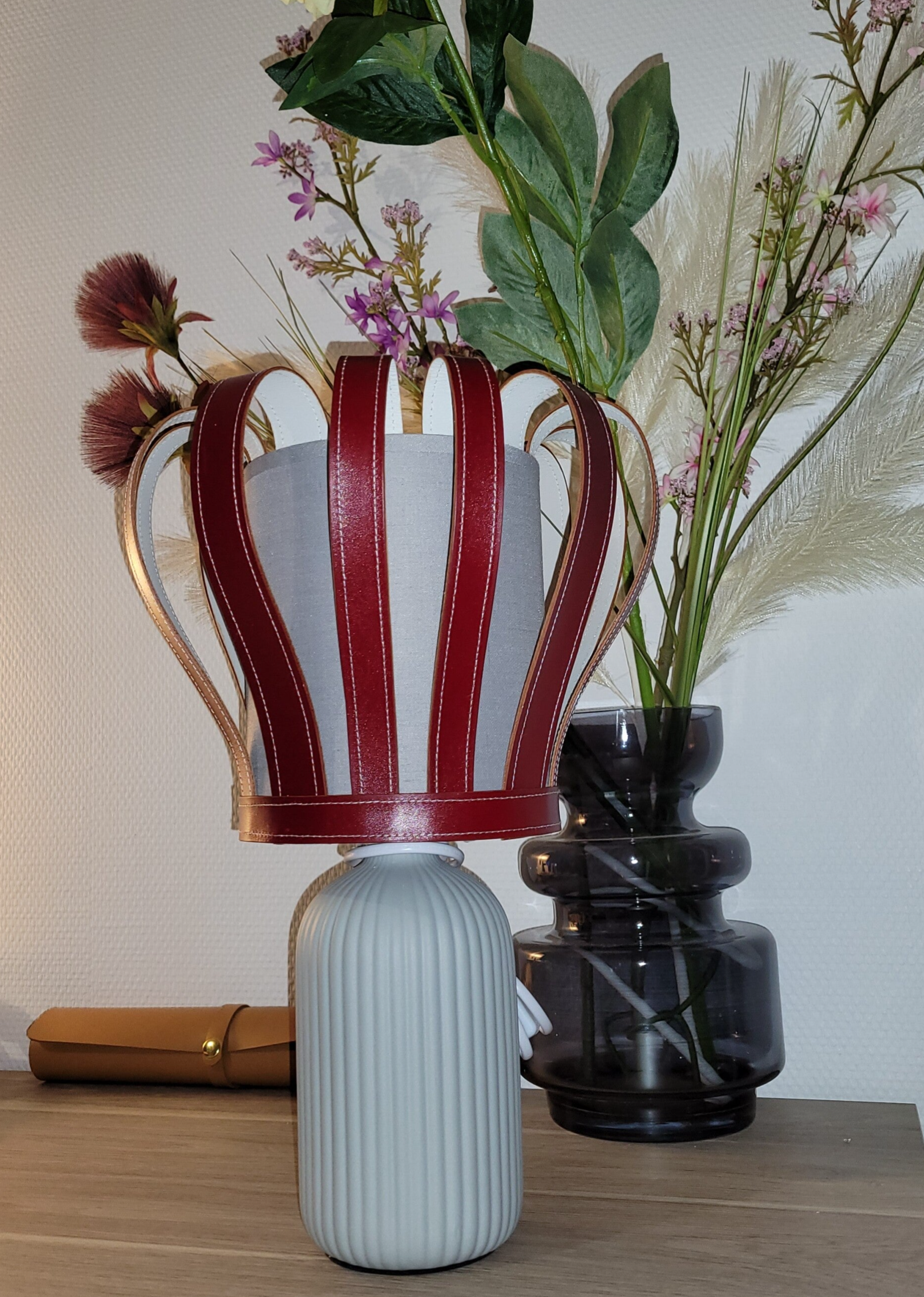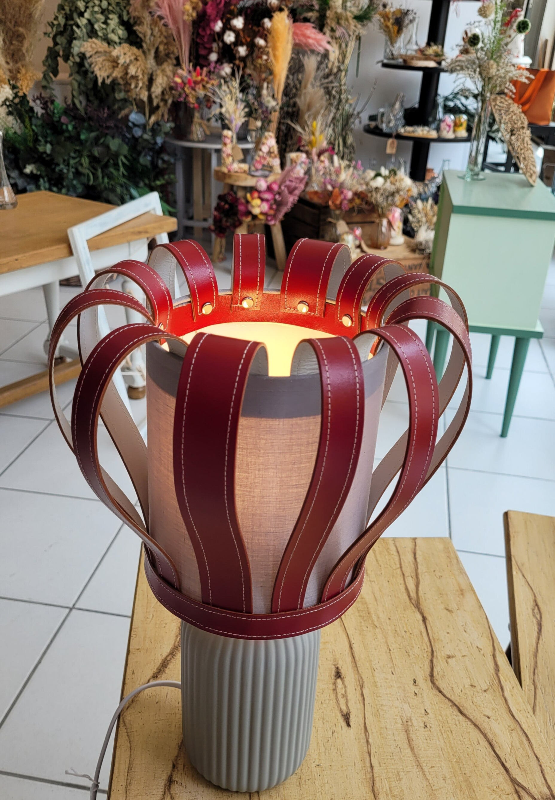 En cuir de vachette, grenat doublé mapa gris clair, cette lampe deviendra la pièce maîtresse de votre décoration d'intérieur le jour et prendra des allures de fleur au bouton d'or une fois allumée le soir.