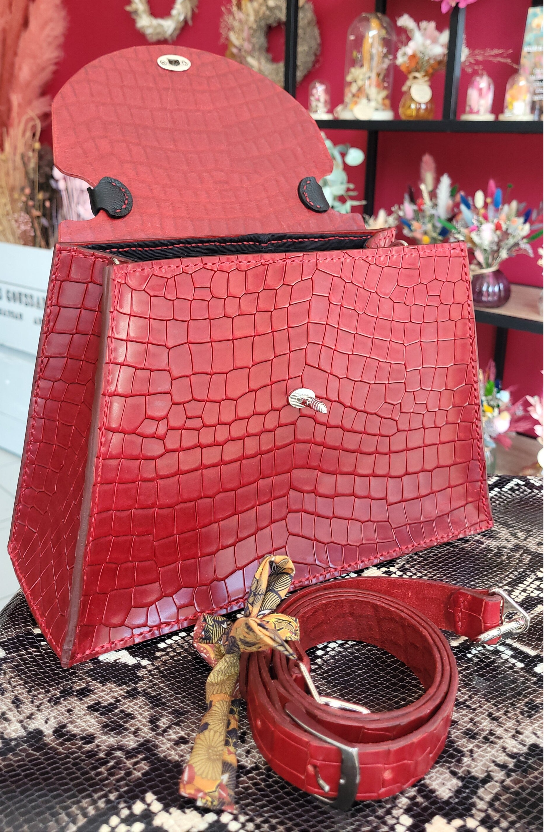Ce sac à main trapèze, est une pièce unique en cuir de vachette imitation alligator.