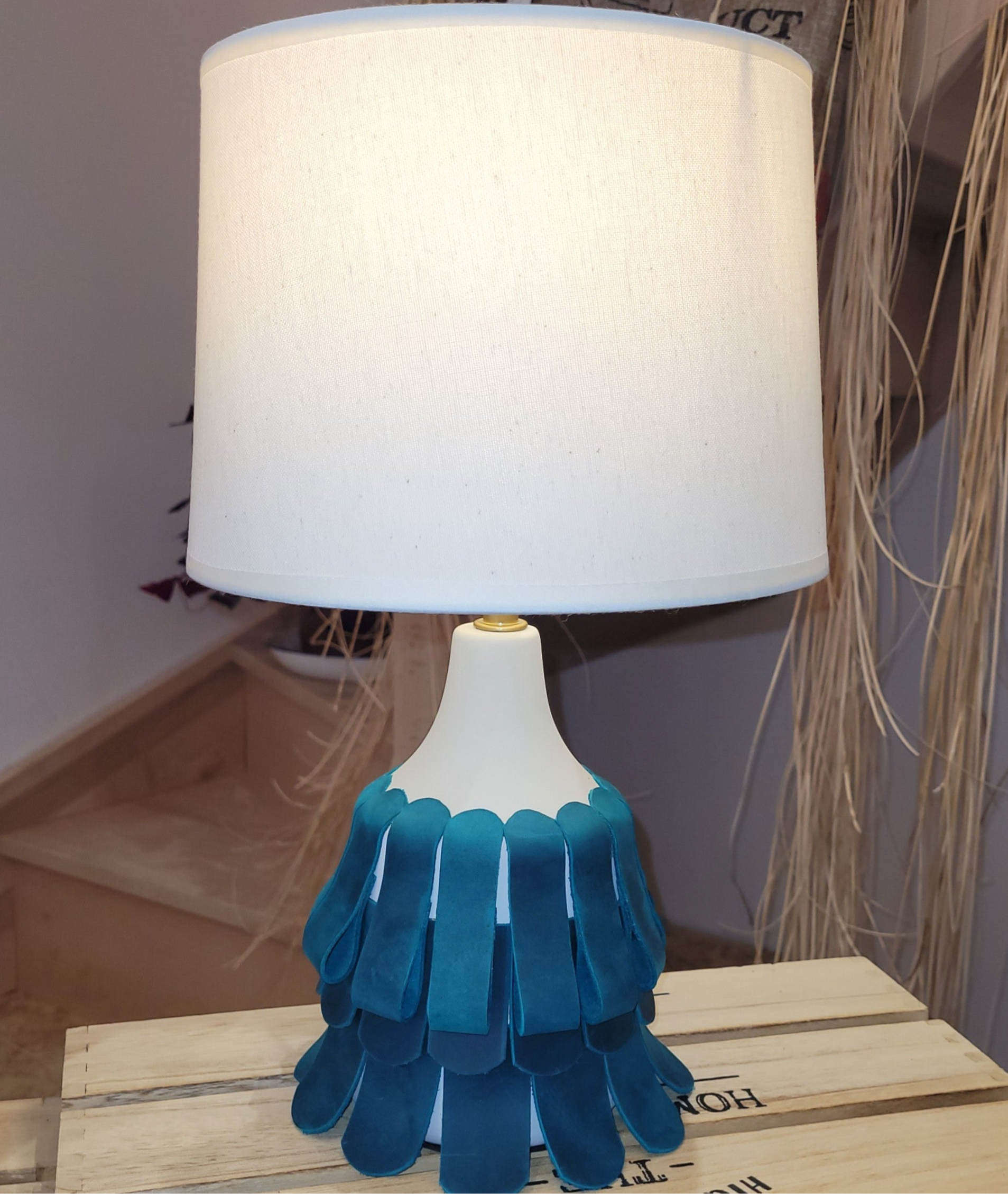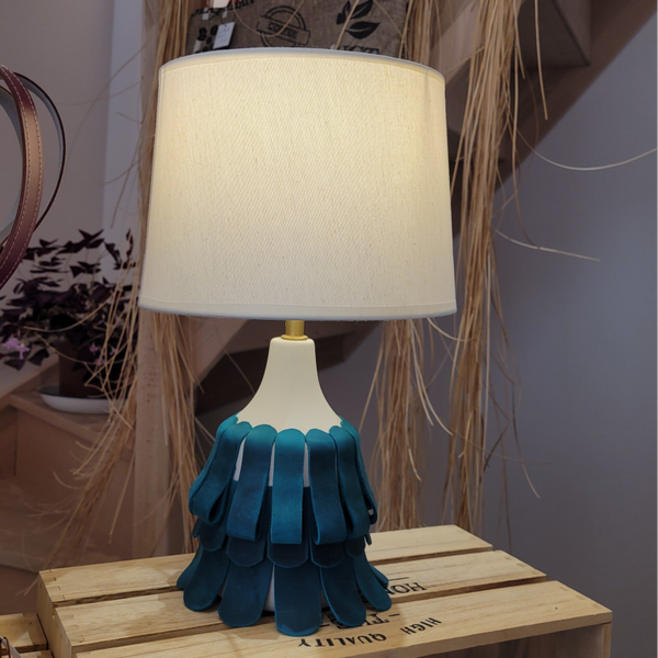 Cette lampe d'ambiance à la robe en cuir pull-up bleu canard donne du caractère à votre décoration d'intérieur.