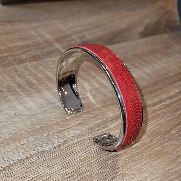 Bracelet manchette fin inox et cuir rouge écaillé