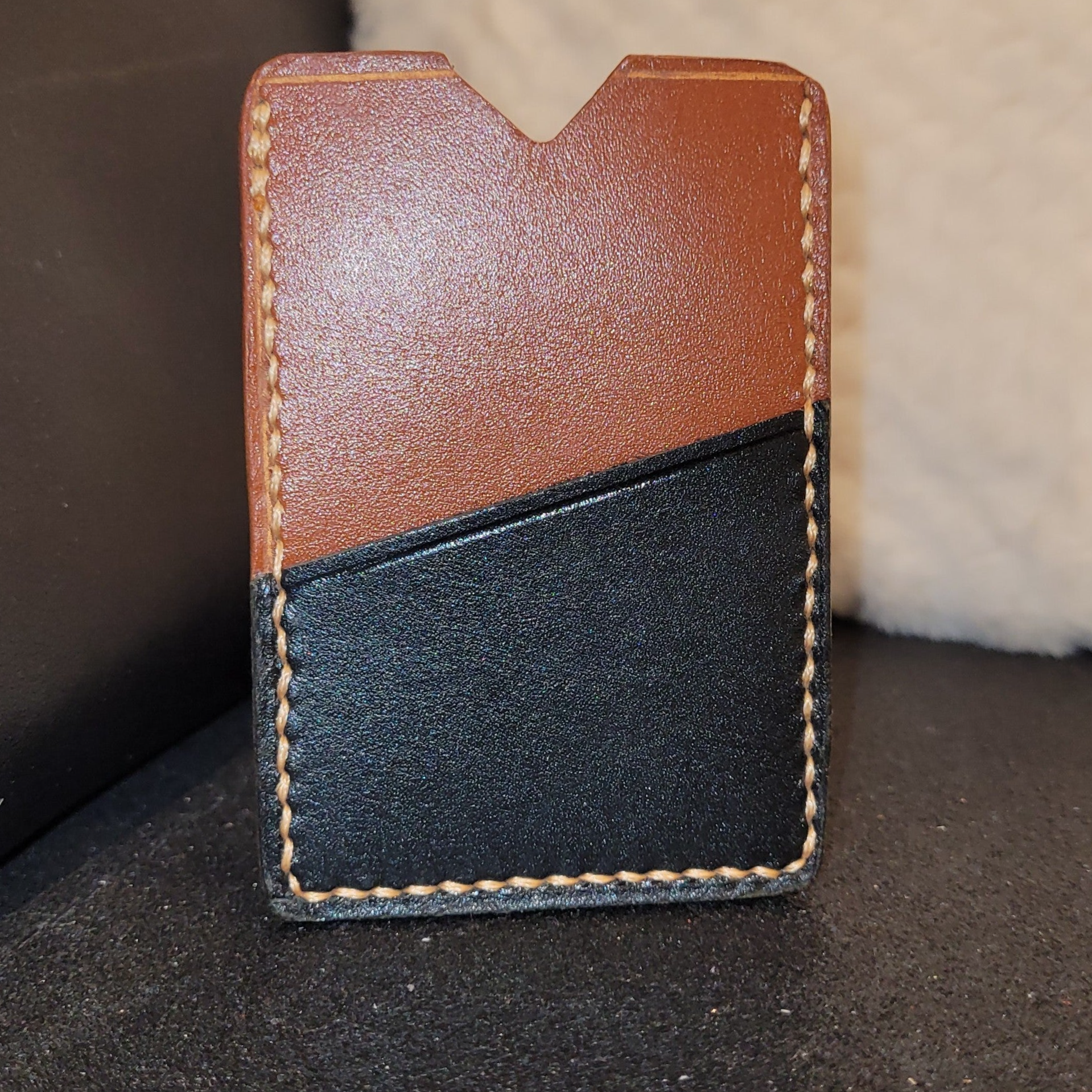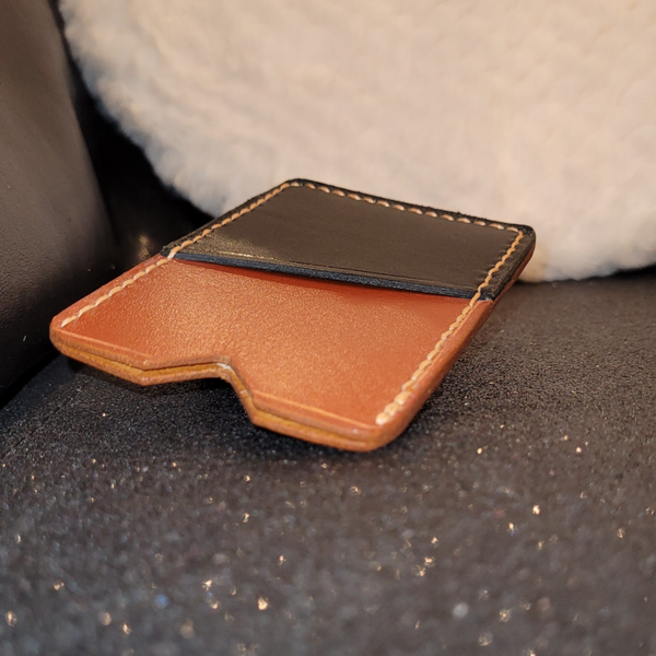 En duo de cuir de vachette, cet étui à carte est une pièce unique cousue main.