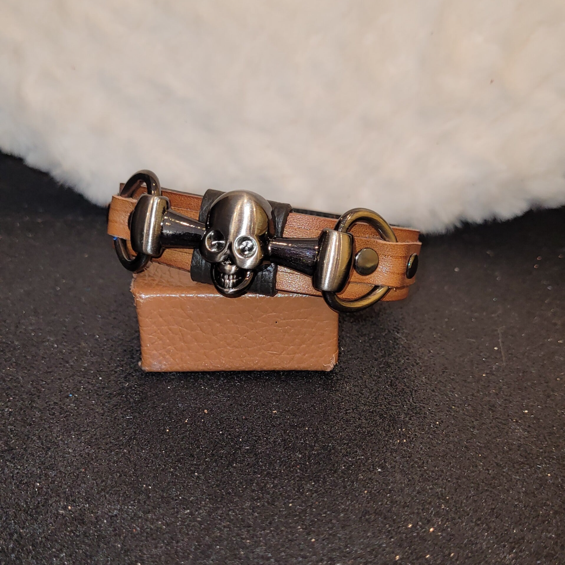 Son bijou en acier inoxydable tête de mort donne un style rock'n'roll à ce bracelet qui s'attache avec un bouton de col. Pièce unique ANA M.