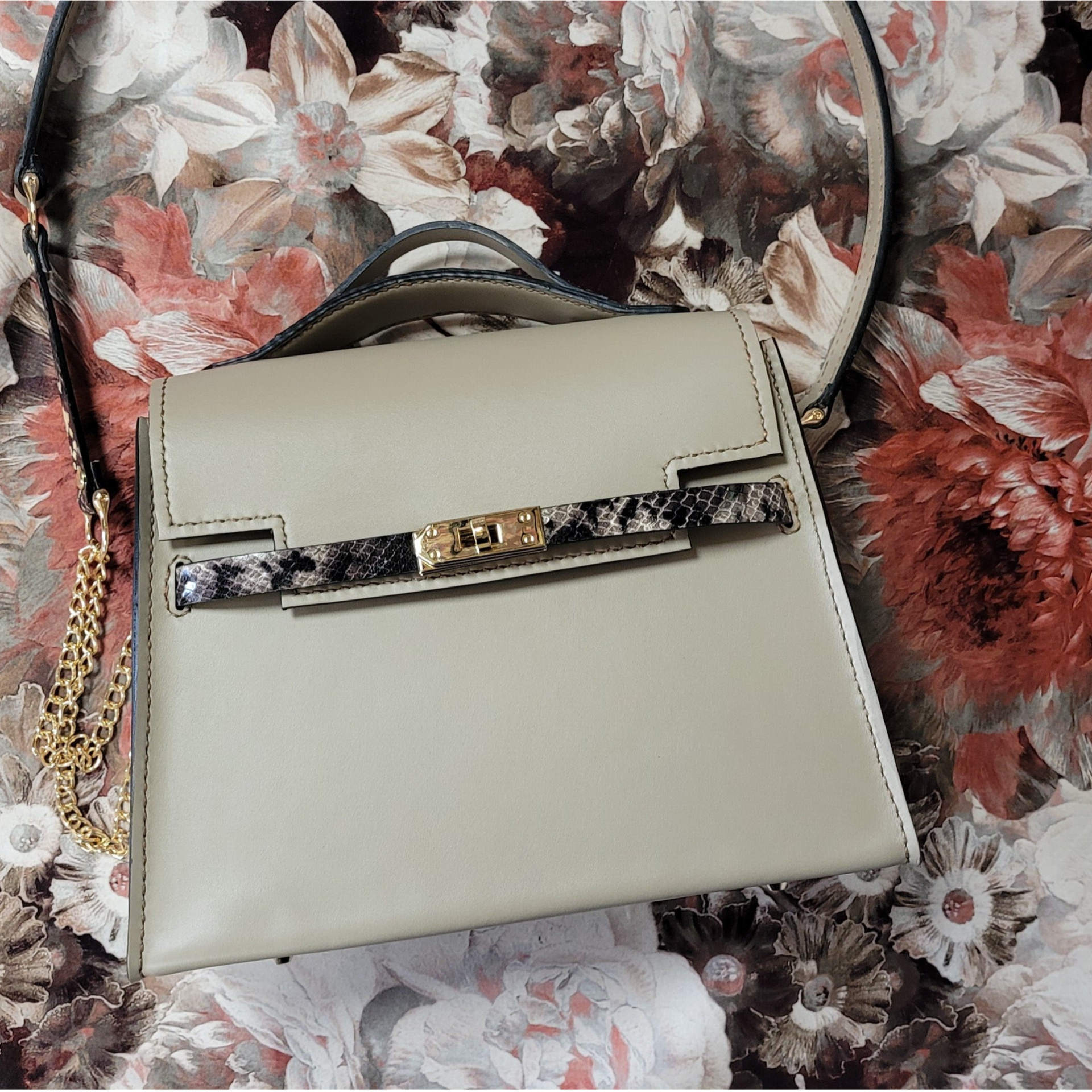 Peau de veau, peau de chèvre, bijouterie en acier inoxydable doré.