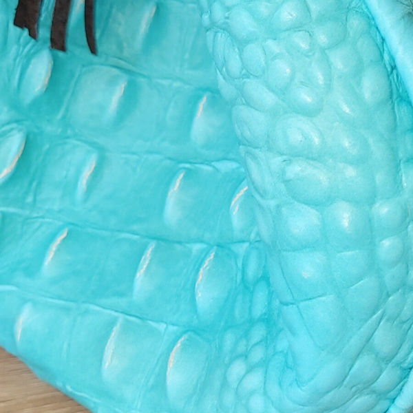 Ce sac à main en vachette imitation croco bleu turquoise style vintage et cuir de porc marron ébène se porte à la main.
